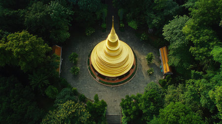 A stunning aerial view of a golden pagoda nestled among lush greenery. This serene landscape captures the tranquility and beauty of nature, perfect for travel and relaxation themes.