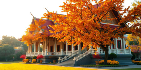 A stunning glimpse of traditional architecture framed by vibrant autumn foliage, capturing the peaceful essence of nature and culture in a beautiful garden setting.
