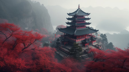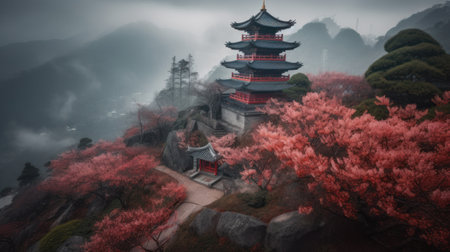 majestic china pagoda rising above misty mountain range, created with generative ai