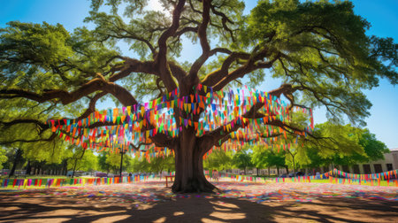 Infrared photography, a large tree with a wide, gnarled trunk and sprawling roots, surrounded by flower pots