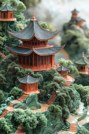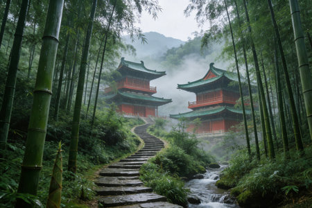 Tranquil japanese temple in misty mountains serene and ancient beauty in fantasy setting