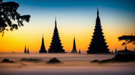 Mystical towers and pagodas shrouded in fog. Mystery and mystery in ancient architecture. Creative, AI Generated