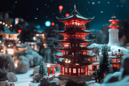 peaceful garden with chinese pagoda and bonsai trees, created with generative ai