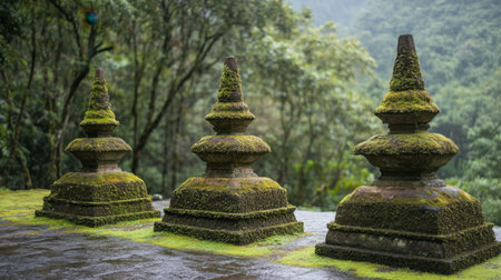 Three ancient stone stupas adorned with lush green moss in a tranquil outdoor setting, showcasing nature's beauty and cultural heritage amidst a misty forest.