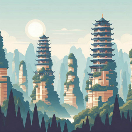 Landscape with pagodas and temples in the mountains. Vector illustration.