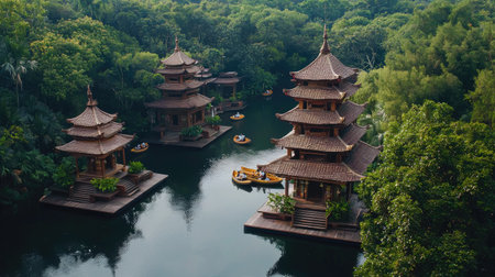 This stunning aerial view captures traditional Asian pavilions nestled among lush greenery, reflecting in calm waters. A perfect setting for relaxation and tourism.