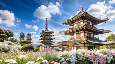 Tranquil Japanese temple with pagodas and blooming flowers under a bright blue sky.