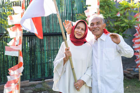 Asian grandparents stood side by side wearing red and white clothes carrying Indonesian flags