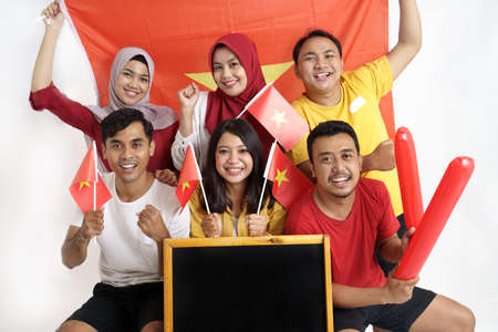 indonesian students holding national flag with fist hand gesture in isolated background