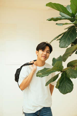 Teenage guy in jeans and white t-shirt standing next to the tree with green leaf at the white wall.