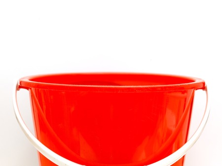 Iron yellow bucket with red wooden figures on a blue background, empty space on the right