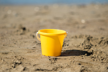 A vibrant plastic bucket rests on a wet sandy beach, surrounded by gentle waves and bubbles, evoking feelings of summer fun and childhood memories. Perfect for beach-themed imagery.
