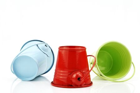 Two empty buckets of purple and red color on a blue background. Business concept. Web banner.