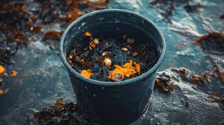 A sea bucket containing a collection of seaweed and tiny marine creatures, showcasing tidal pool discoveries.