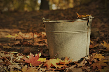 Still life with a metal galvanized bucket on the grass near the old stairs in the garden in the countryside. Harvest time. Gardening. Agriculture. Eco farming
