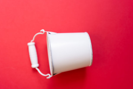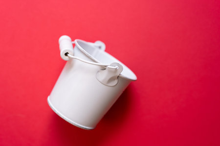 Minimalist composition with a childs toy bucket on a gray-pink background. Metal empty bucket on two-color surface. Top view.