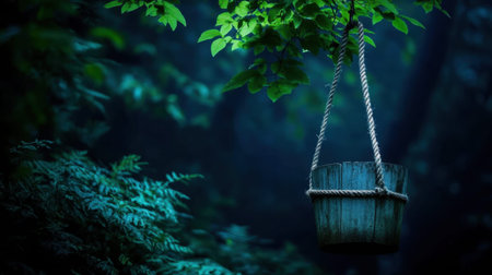 A rustic wooden bucket hangs gracefully from a branch, surrounded by lush green leaves in a tranquil forest, creating an enchanting and serene ambiance.