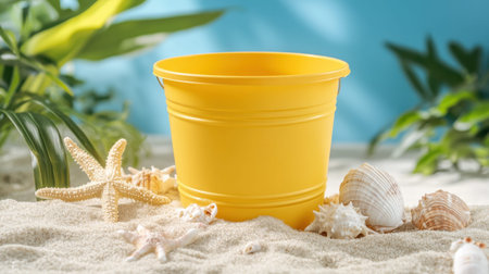A vibrant yellow bucket sits on a sandy beach, surrounded by beautiful seashells and starfish, with lush tropical greenery and a clear blue sky providing a perfect summer backdrop.