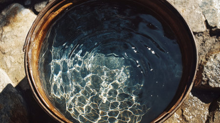 A rustic metal bucket filled with crystal clear water showcases beautiful sunlight reflections, creating a peaceful outdoor scene perfect for gardening and nature themes.