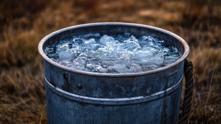 A metal bucket filled with clear, cold water and ice cubes is depicted against a serene natural background. The warm lighting reflects a tranquil evening scene.