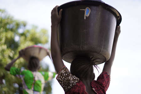 Backshot Of A Young African Girl Carrying Heavy Water Bucket Back Home From the Village Borehole