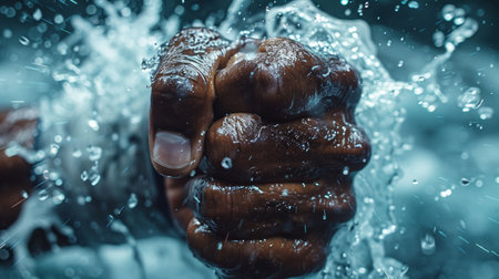 A powerful fist breaks through water during a intense fight, with signs of impact like broken teeth visible.