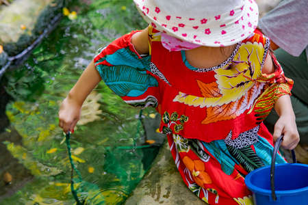 Woman catching fish in the river. Young women in local clothing catching fish with landing net.