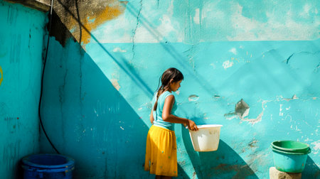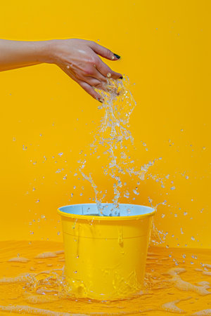 A hand pours water from a height into a yellow bucket, splashing water droplets across the yellow background.