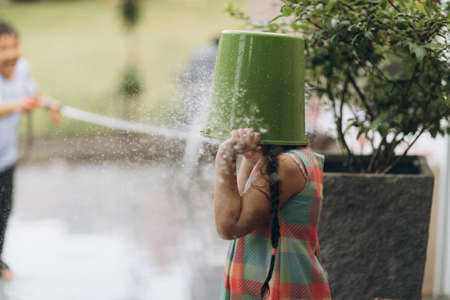 children play in the garden with guns and water rifles on a sunny summer day having a lot of fun