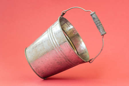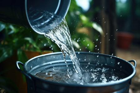 A person is pouring water into a metal bucket. This image can be used to depict household chores, gardening, or water conservation.