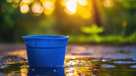 A vibrant blue bucket sits amidst a puddle in an autumn park, reflecting the soft sunlight filtering through the trees, showcasing nature's serene beauty.