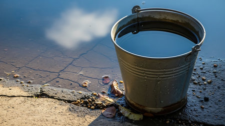 A rusty metal bucket filled with water on cracked dry earth, symbolizing hope and resilience in a desolate landscape