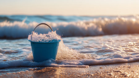 A creative shot of a sea bucket being used to capture a wave, symbolizing summer fun.