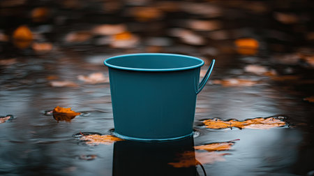 A teal bucket floating on water with autumn leaves in the background, product photography, fall vibes. --chaos 30 --ar 16:9 --v 6.1 Job ID: 74653f43-79c2-4f40-9d04-1c6e2a1dd977