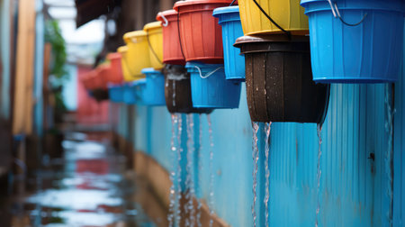 Colorful buckets are arranged on a boat deck, contrasting beautifully against the turquoise water. This scene captures the essence of maritime life and vibrant colors.