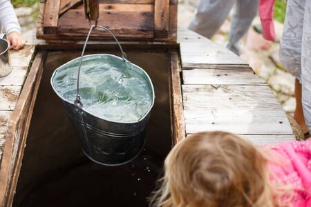 Close-up of a hand-crank water pump beside a shallow well, with a metal bucket catching the flowing water.