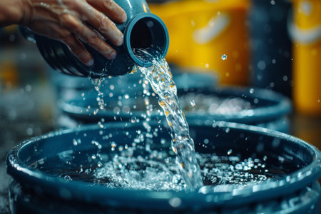 A captivating image of water pouring from a container into a dark blue barrel, showcasing the dynamic motion and shimmering surface of the liquid.
