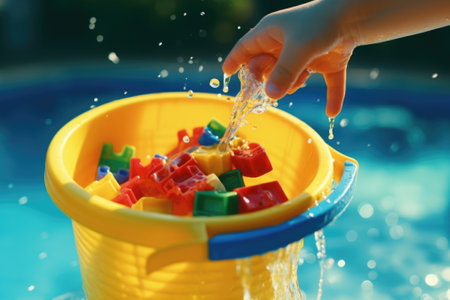 A child's hand is pouring water into a yellow bucket filled with colorful legos. This versatile image can be used to depict creativity, playtime, or educational activities.