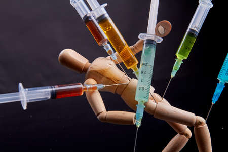 Close-up colorful syringes stucked in a wooden mannequin dummy. Drug dependence and addiction concept.