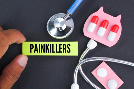 stethoscope and medicine with the word painkiller. the concept of painkillers