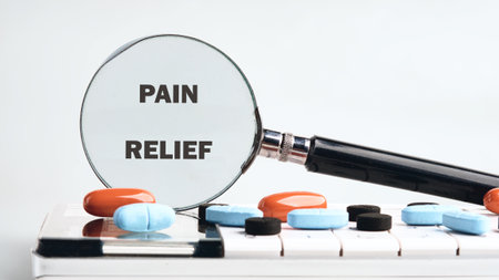 Focused on discovering pain relief, vibrant pills sit on a white surface while a magnifying glass amplifies the words, drawing attention to the quest for comfort and healing.