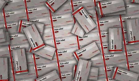 Pain relief tablets box production line. Emergency painkiller, headache analgesic and help medical pills pack factory. Abstract concept 3d rendering illustration.