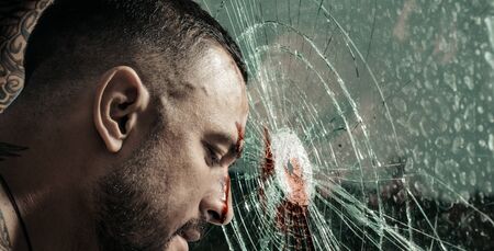 Destroy obstacles. Handsome brutal man near broken glass. Brutal handsome macho focused on fight result. Want to fight right now. Fight concept. Man muscular body punching. Concentrated on target