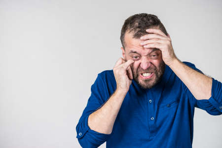 Portrait of a man with a headache on a white background.