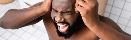 panoramic shot of afro-american man screaming from headache and holding glass of water near temple