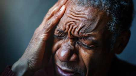 A man grimaces in discomfort, holding his head in his hands, revealing the intensity of his headache. The somber light enhances the mood of the moment.