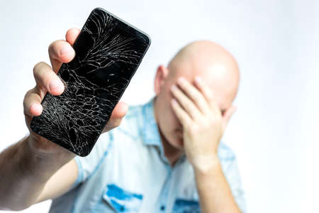 Phone With A broken screen close-up. A white man is holding a black smartphone with a cracked display.