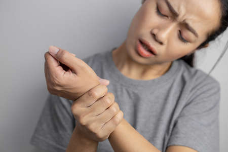 Woman suffering from pain in wrist. Pain in a women wrist. Young woman holding her painful wrist on wall background.
