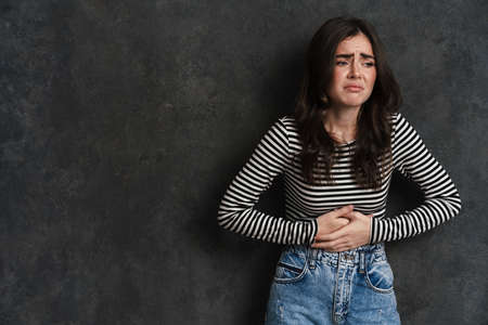 Woman holding her stomach suffering from an abdominal ache isolated over background