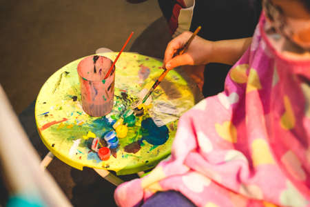 An little artist is dipping a paint brush into a watercolor palette. Little Artist with palette and brushes. Close up of a glass of water with a brush and color palette for painting.
